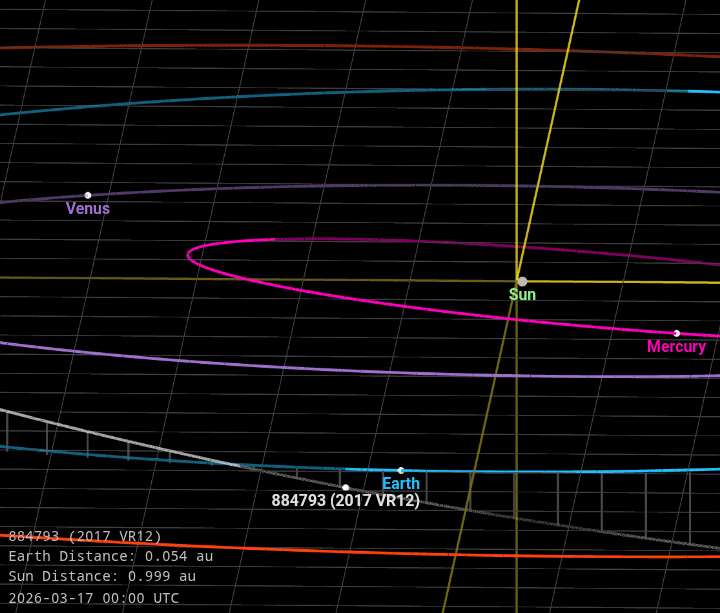 Asteroid 884793 (2017 VR12) is scheduled for a significant close approach to Earth on 19 March 2026 at 17:39 TDB. This encounter is part of its routine orbit as an Apollo-class Near-Earth Object (NEO) and a Potentially Hazardous Asteroid (PHA), though it poses no immediate impact risk.
