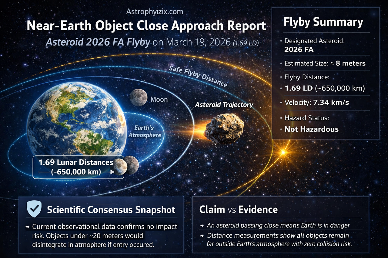The nearest object in this reporting window is 2026 FA, a small near-Earth asteroid approximately 8 meters in diameter. It will pass Earth at a distance of 1.69 lunar distances (~650,000 km) on 19 March 2026.