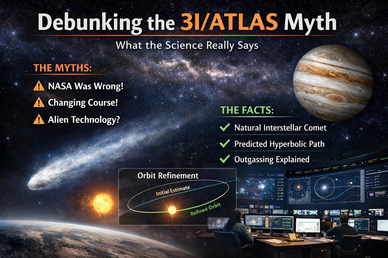 In late 2025, the interstellar visitor 3I/ATLAS captured worldwide attention—not just from astronomers, but from social media, sensational headlines, and speculation about its origin and behaviour. Some videos and posts claimed that NASA was “wrong” about the object’s trajectory, implying dramatic course changes, artificial propulsion, or even extraterrestrial technology. This article corrects those myths with clear, evidence‑based science from credible observational campaigns and peer‑reviewed research.